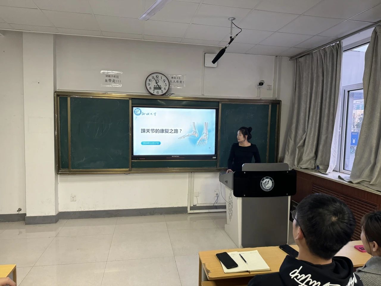 本次活动由运动人体科学专业的安晓丽作为分享人,倾囊相授。开场便点明踝关节在各类运动中的关键作用与损伤风险,瞬间抓住了听众的心。在紧急处理环节,她结合实例,细致讲解损伤后的正确操作,从RICE原则的精准运用,到现场示范简易固定技巧,让复杂理论直观易懂。谈及康复阶段,安晓丽从康复训练的分期规划,到各阶段针对性的力量、平衡、灵活性练习要点逐一拆解,还分享了利用弹力带、平衡球等小工具在家高效康复的窍门,实操性满满。