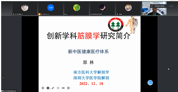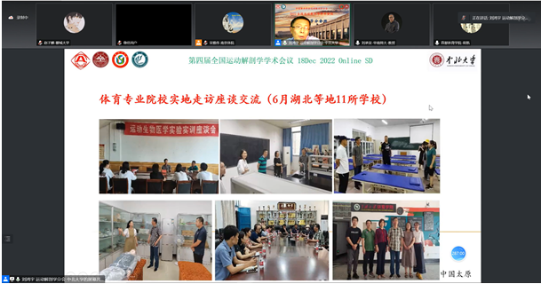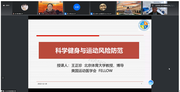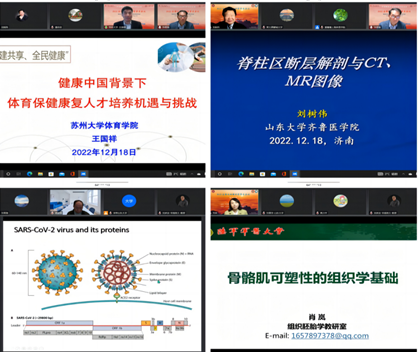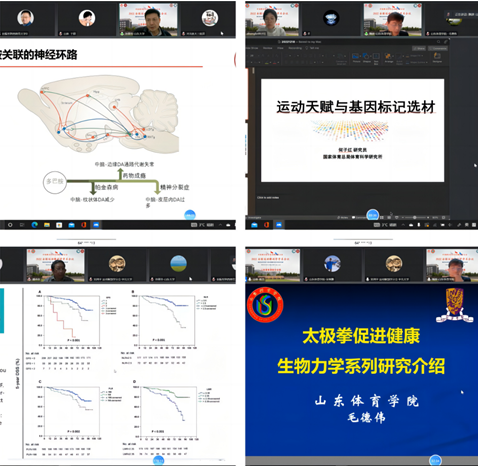 18日晚上,在山东太阳成集团tyc122ccvip分会场举办线上学术报告,本次会议由山东太阳成集团tyc122ccvip运动与健康学院院长隋波教授、河北医科大学吴文娟教授、陕西师范大学田振军教授、中国医科大学潘诗农教授主持,山东太阳成集团tyc122ccvip原校长毛德伟教授、国家体育总局体育科学研究所何子红老师、中国医科大学潘诗农教授、山东大学孙晋浩教授、华南师范大学刘承宜教授分别围绕太极拳促进健康生物力学系列研究、运动天赋与基因标记选材、膝关节运动损伤的影像解剖学分析、运动与多巴胺及活体电化学检测递质释放、患者的准身体模型做了相关汇报。