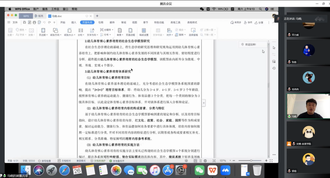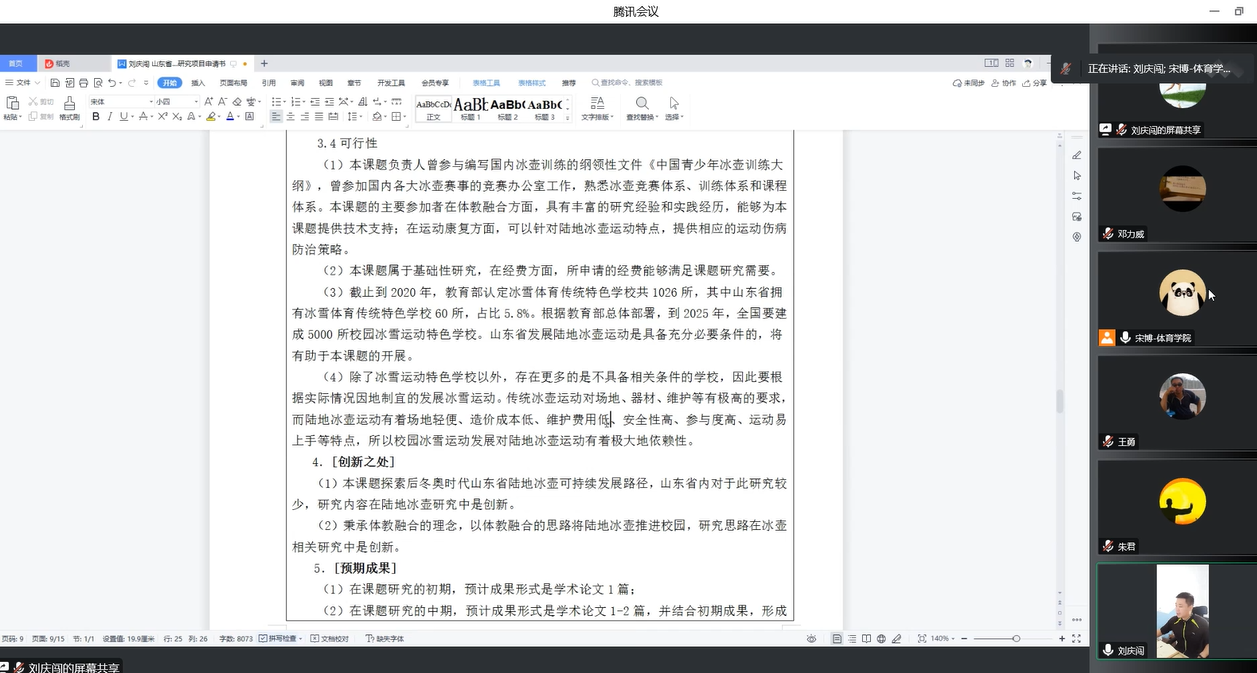 11月26日,太阳成集团tyc122ccvip线上开展了学术团队课题研讨活动,本次学术活动分别由“运动员核心竞技能力评价与促进团队”的马晓老师和“民族传统体育文化弘扬与传承团队”的刘庆闯老师进行了省社科课题申报书的汇报。马晓作了题为《基于社会生态学模型的幼儿体育核心素养培育体系研究》的报告,刘庆闯作了题为《体教融合背景下山东省陆地冰壶可持续发展路径研究》的报告。本次研讨会由科研秘书宋博主持。