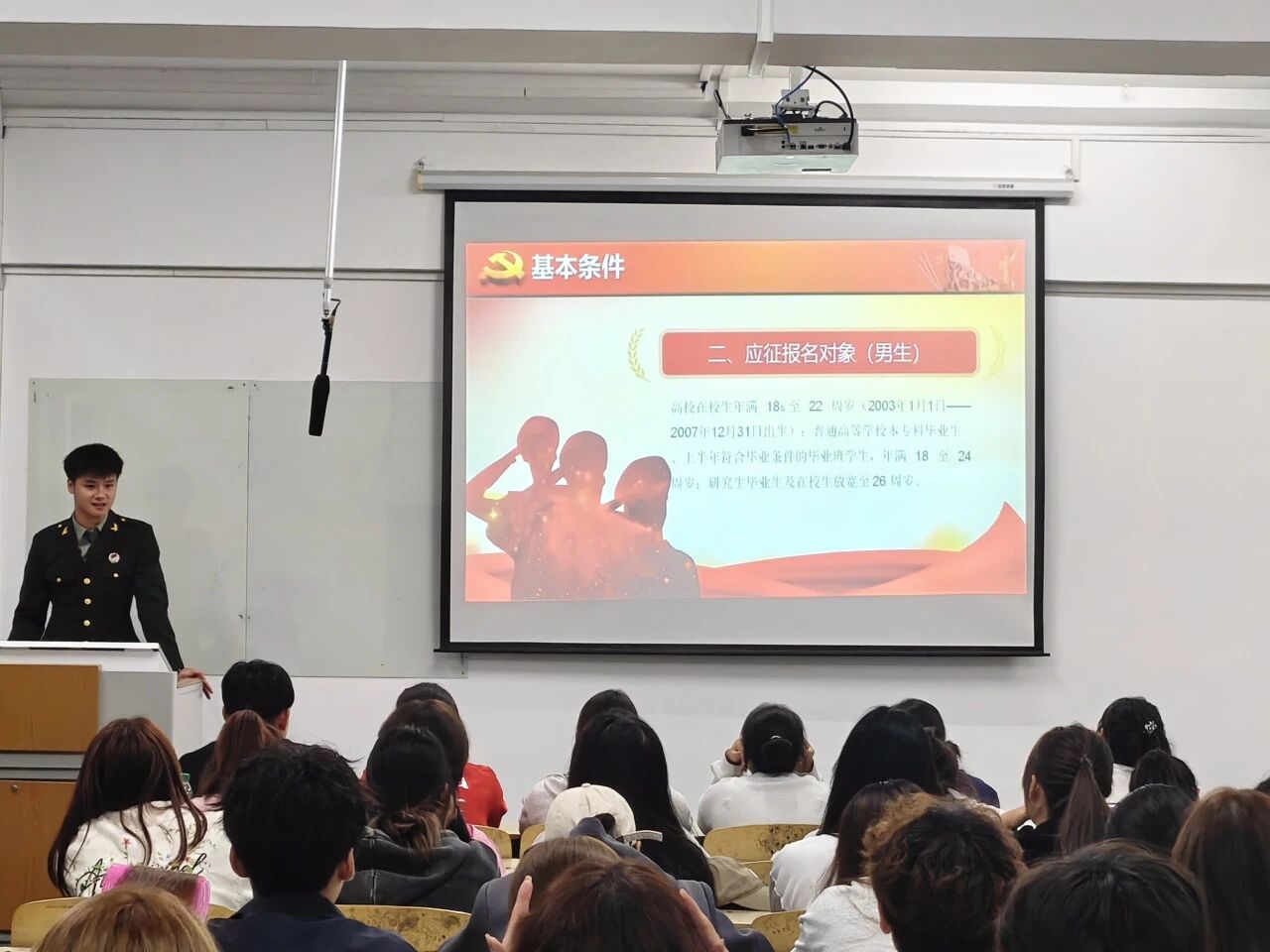 活动现场互动氛围热烈,学子们围绕“入伍体检特殊要求”“教导营日常训练强度”“参军后学业衔接方式”等关切问题踊跃提问,主讲人结合政策文件与实际经验逐一细致解答,现场掌声不断。不少同学表示,此次宣讲既理清了入伍政策的“关键要点”,也读懂了教导营“校园强军阵地”的育人初心,未来将认真考虑投身国防事业。