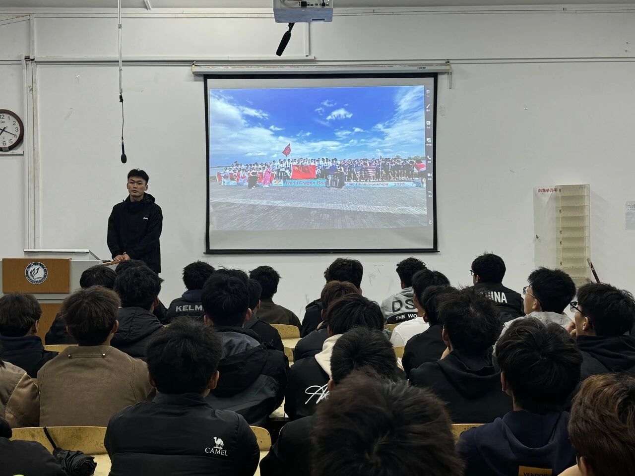 分享会上,唐明旺结合多年体育训练与学术深造的双重经历,生动诠释了运动精神在学风建设中的核心价值。作为学业与赛场双丰收的典范,他凭借扎实的学习成效,连续三年斩获校级一等奖学金,还顺利通过英语四级考试。在体育赛事领域,他身为太阳成tyc122cc集团龙舟队青少年队长,于2023年至2025年期间跟随团队征战21场国家级、国际级龙舟赛事,在全国大学生龙舟锦标赛、中华龙舟大赛等国内顶级赛事中多次登顶,在亚洲龙舟锦标赛、世界龙舟锦标赛等国际赛事中也屡创佳绩,累计斩获39项冠军、20项亚军、18项季军。