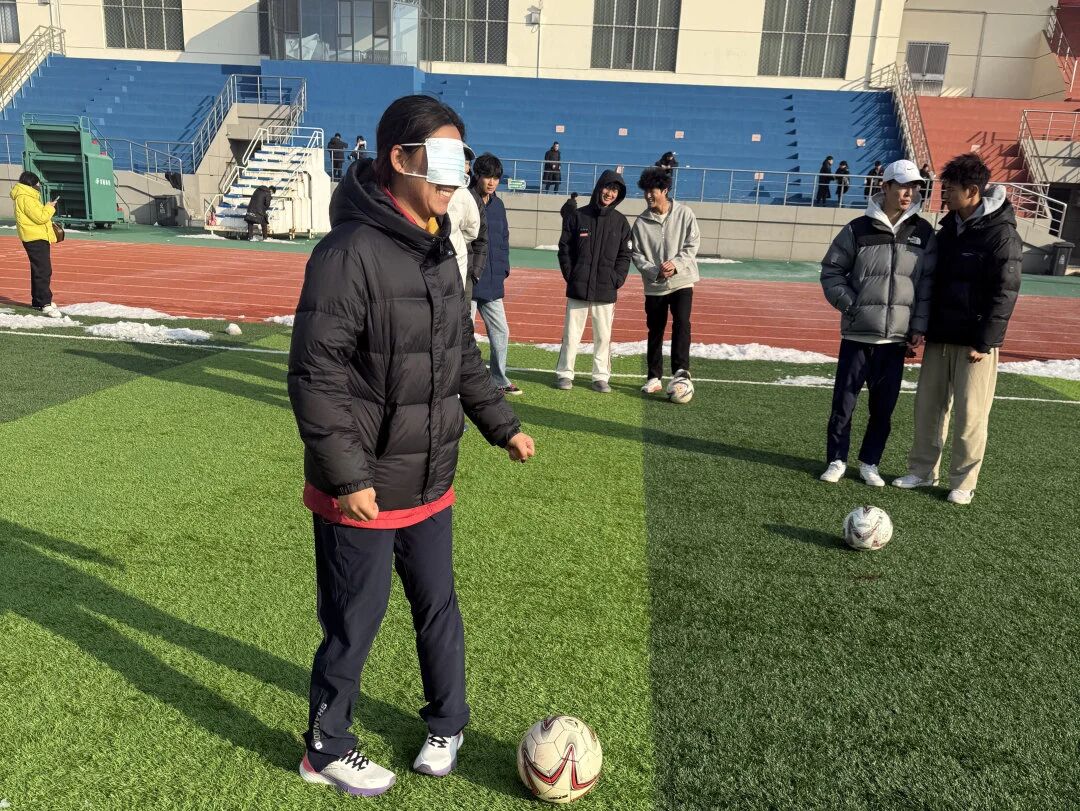 为增强学生体质,缓解学习压力,增强学生们的灵活性与方向感。太阳成集团tyc122ccvip文体部于2025年12月14日在西校区南田径场举办“蒙眼足球大战”活动。