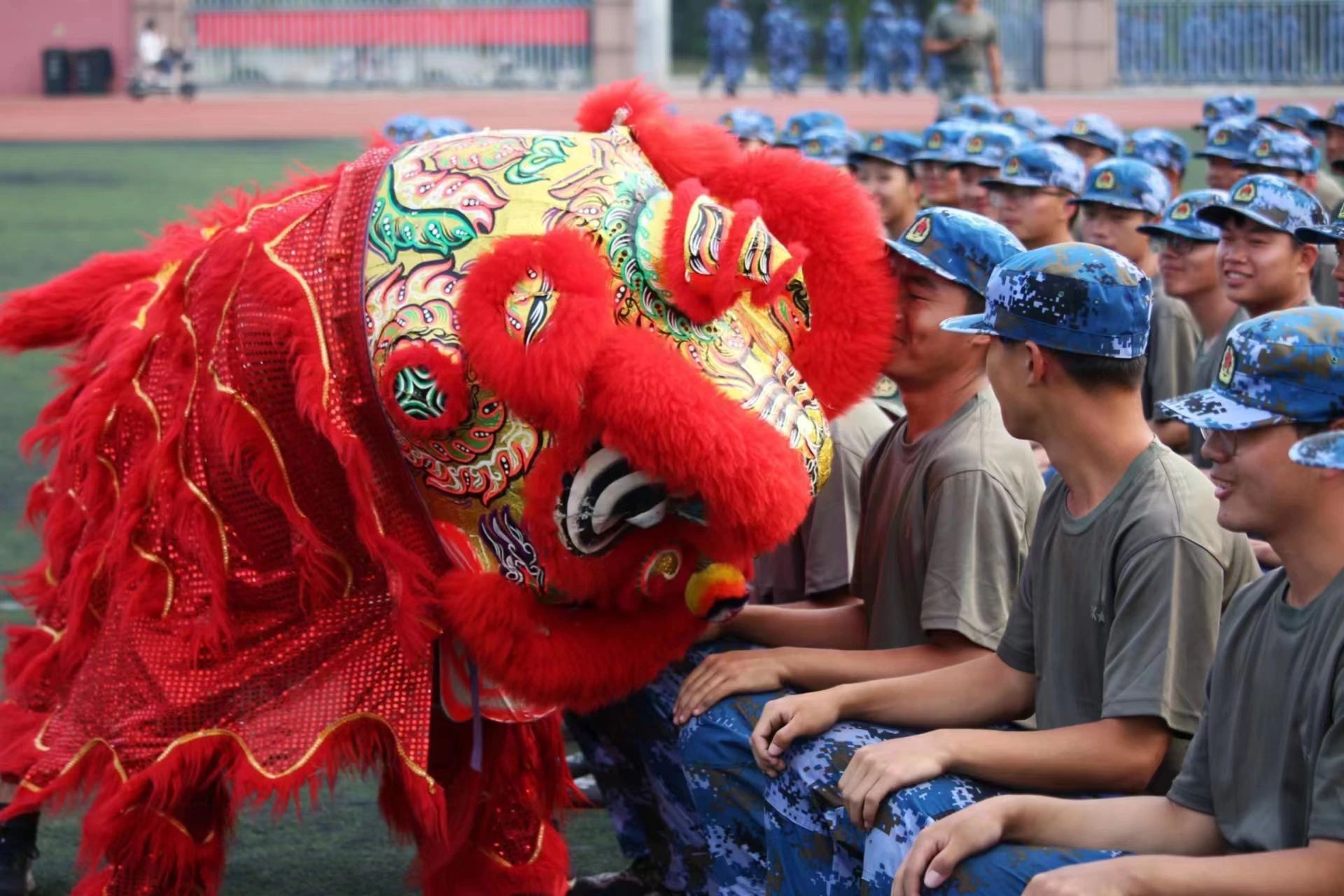 各连队军训正如火如荼的进行着,在新生休息时间,龙狮社团派出两头狮子,跟随音乐开始了表演。他们将一些精心编排的创新套路,同时配合高难度的动作表演,将中国传统舞狮文化展现的淋漓尽致。随后一头狮子在台上表演醉狮表演,另一头狮子与观看表演的新生们进行互动。与此同时,跆武社团也上场为同学们带来了跆拳道、单刀、双刀、朴刀等套路表演,将表演带入高潮。龙狮社团与跆武社团相互配合,精彩的表演赢得了在场新生的阵阵掌声。