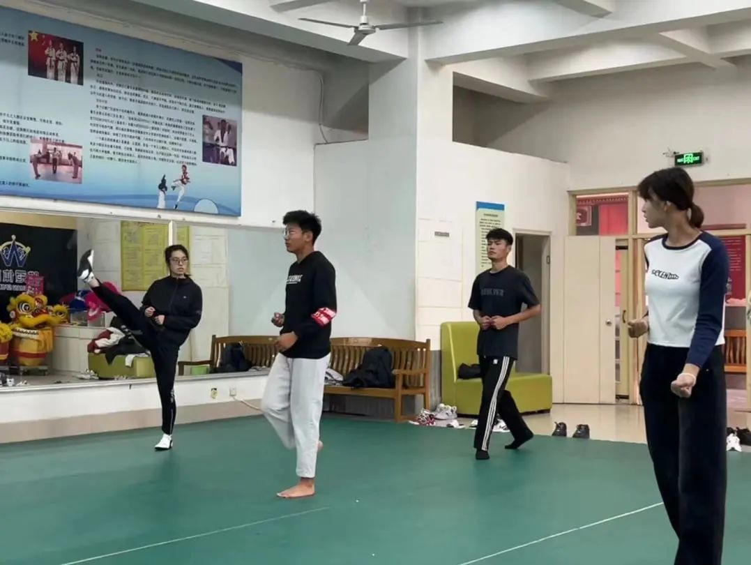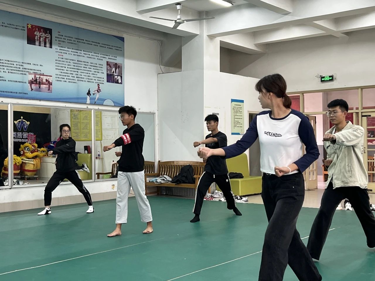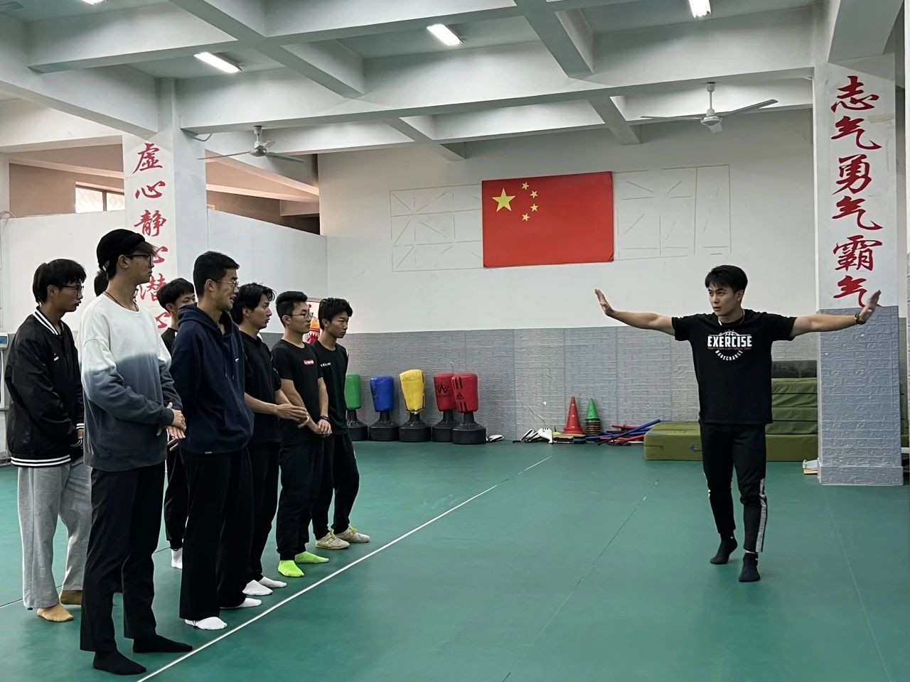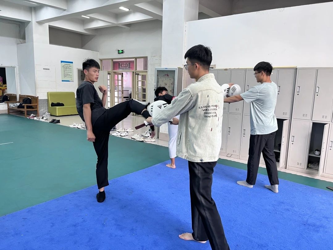 跆武社团的社员们先进行自我介绍,互相了解熟悉,理事长介绍社团内部整体情况,励志跆武社团下设有跆拳道和武术两个项目,同学们根据自己的特点、特长以及兴趣爱好自由选择。社团以同学们自身的特点为出发点设计了强度适中,趣味满满的训练计划,保证及不会受到伤害,又能起到不错的锻炼效果。