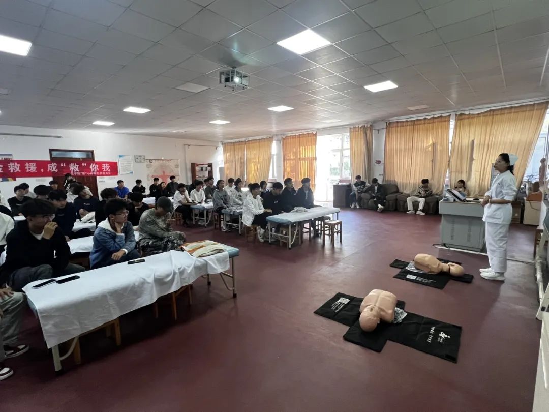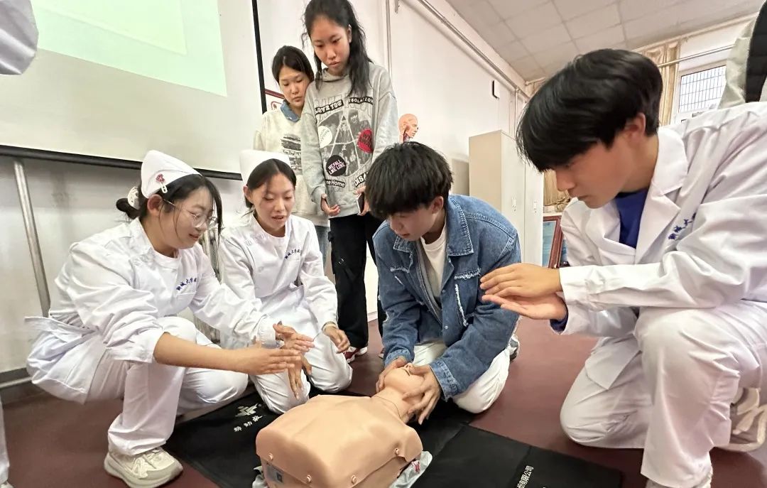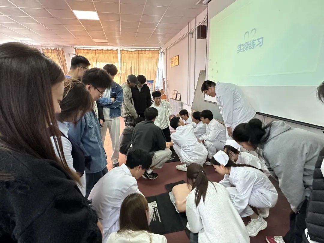 随后进行的急救操作培训中,医学院的同学们进行现场教学,每位同学跟着指导在模拟人体上进行实际操作,进一步巩固了所学的知识,掌握了心肺复苏的基本技能。