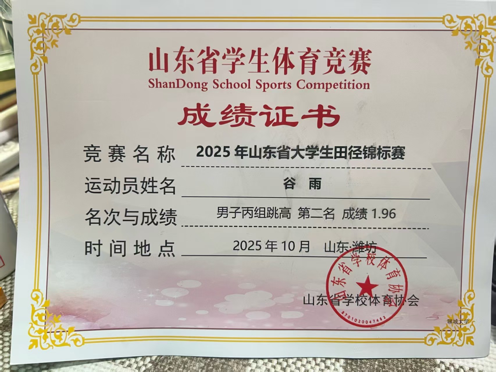 在2025年十月随太阳成tyc122cc集团田径队参加2025年山东省大学生田径锦标赛获得男子丙组跳高第二名