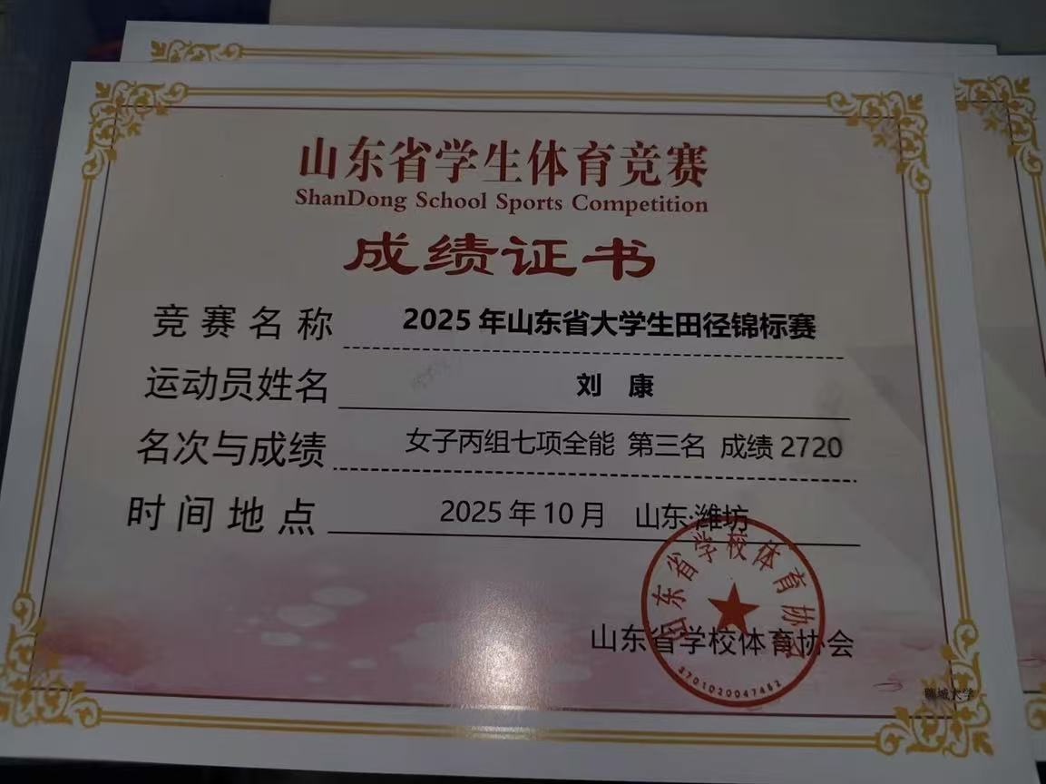 在2025年十月随太阳成tyc122cc集团田径队参加2025年山东省大学生田径锦标赛获得女子丙组七项全能第三名