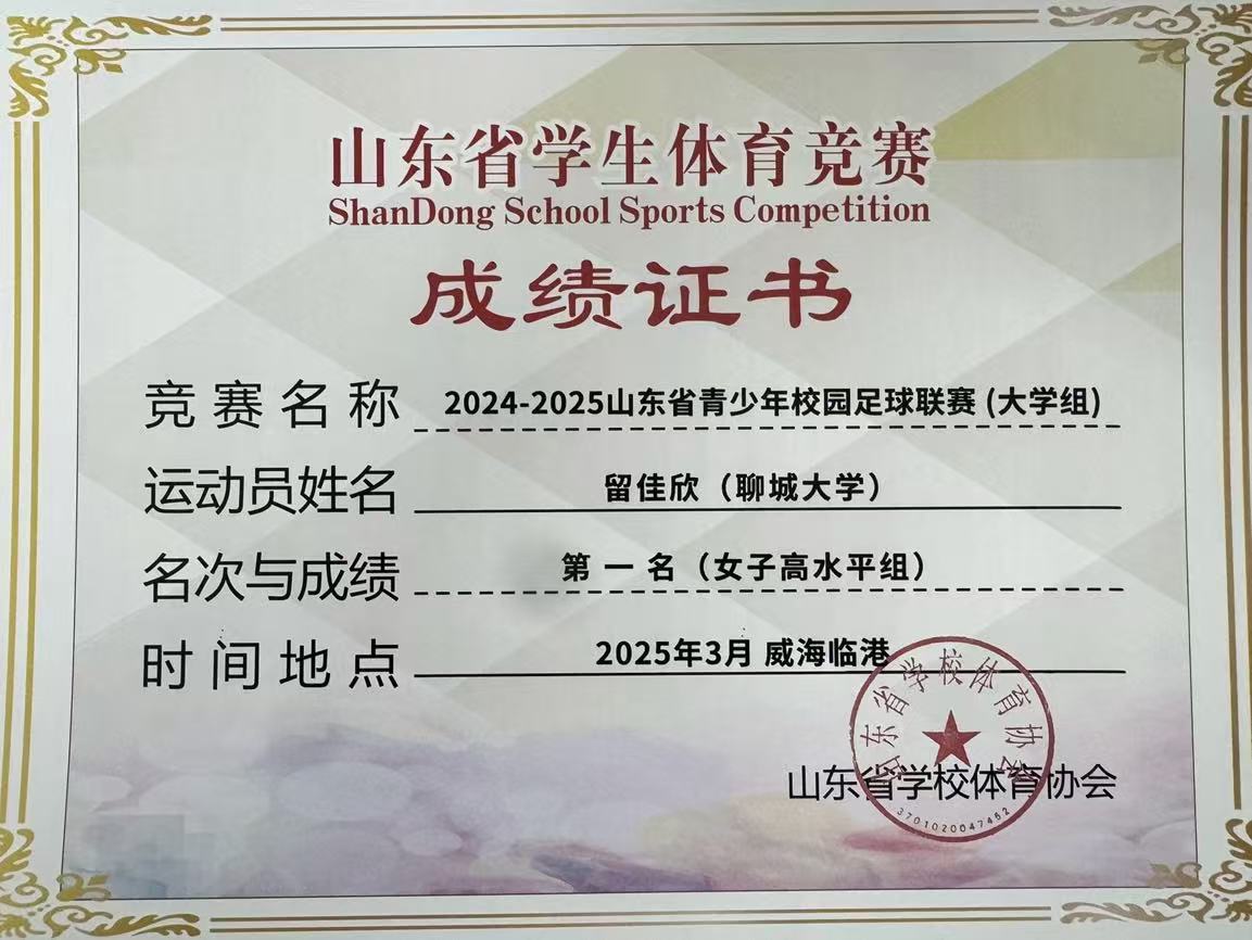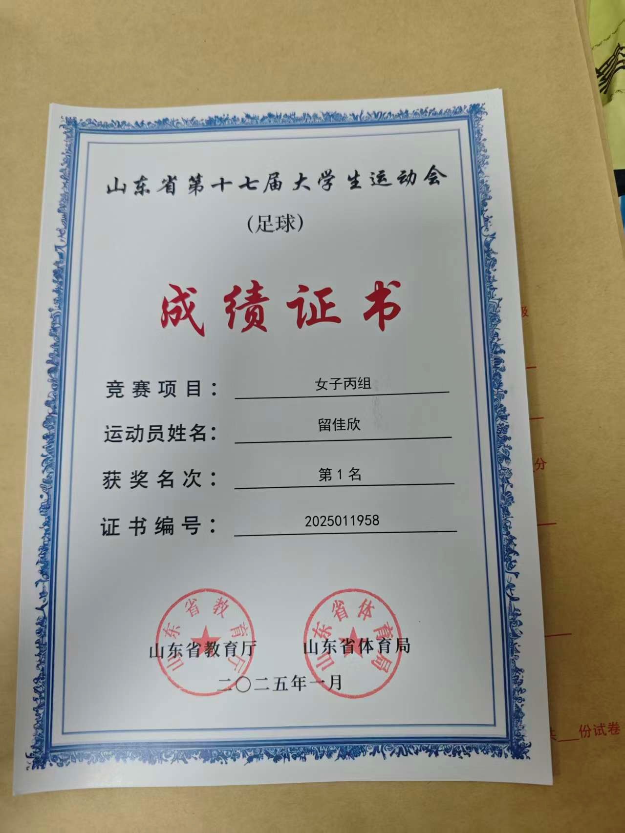 在2025年一月随太阳成tyc122cc集团足球队参加山东省第十七届大学生运动会(足球)获得女子丙组第一名