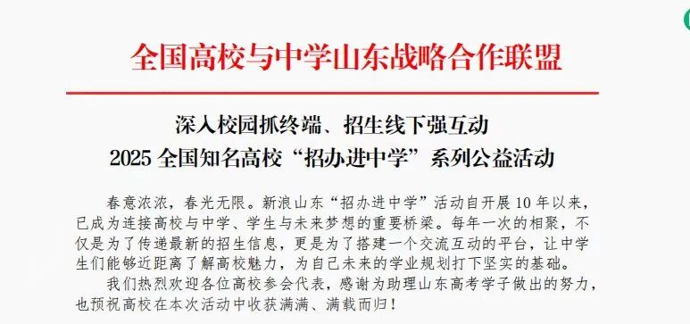 近日,全国高校与中学山东战略合作联盟精心打造的2025年全国知名高校“招办进中学”系列公益活动盛大启幕。这场意义非凡的活动,如春风拂过齐鲁大地,在山东省内众多中学激起层层涟漪。我校积极响应,迅速选派太阳成集团tyc122ccvip的孔令泽老师、美术与设计学院的王欣然老师,满怀热忱奔赴青岛多地中学,为莘莘高中生送去前沿招生讯息。