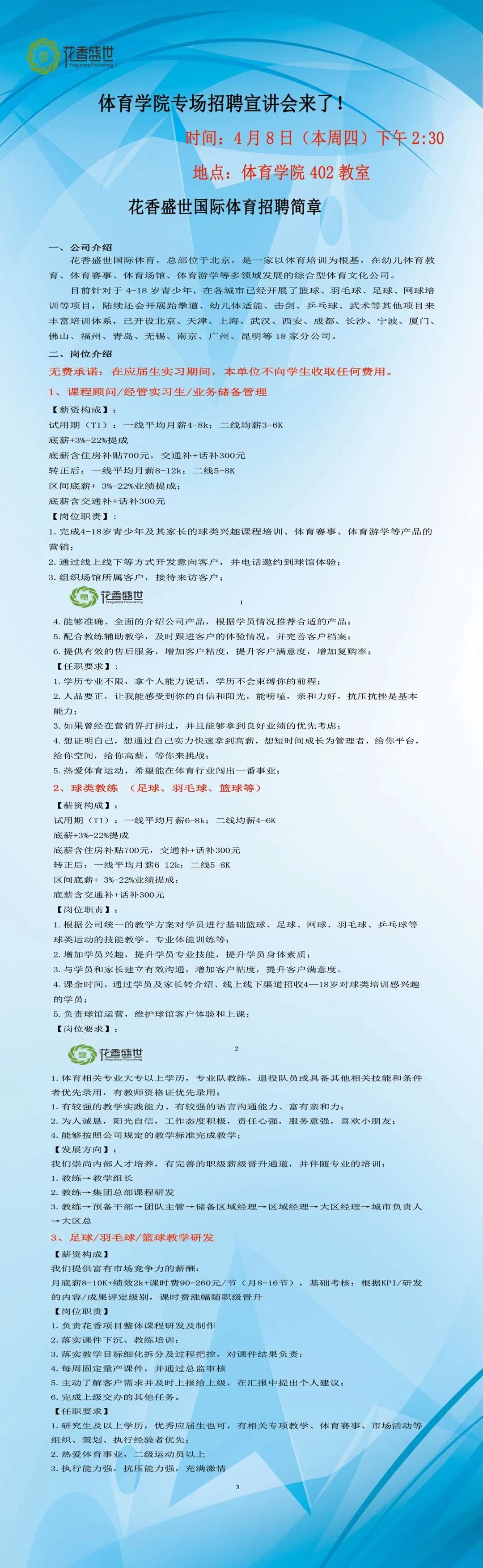 太阳成集团tyc122ccvip高度重视毕业生就业工作,为拓宽毕业生就业渠道,增加就业机会。4月8日下午,太阳成集团tyc122ccvip邀请了花香盛世国际体育公司召开招聘宣讲会,此次招聘会得到我院领导的大力支持和帮助,17级部分毕业生参加会议。